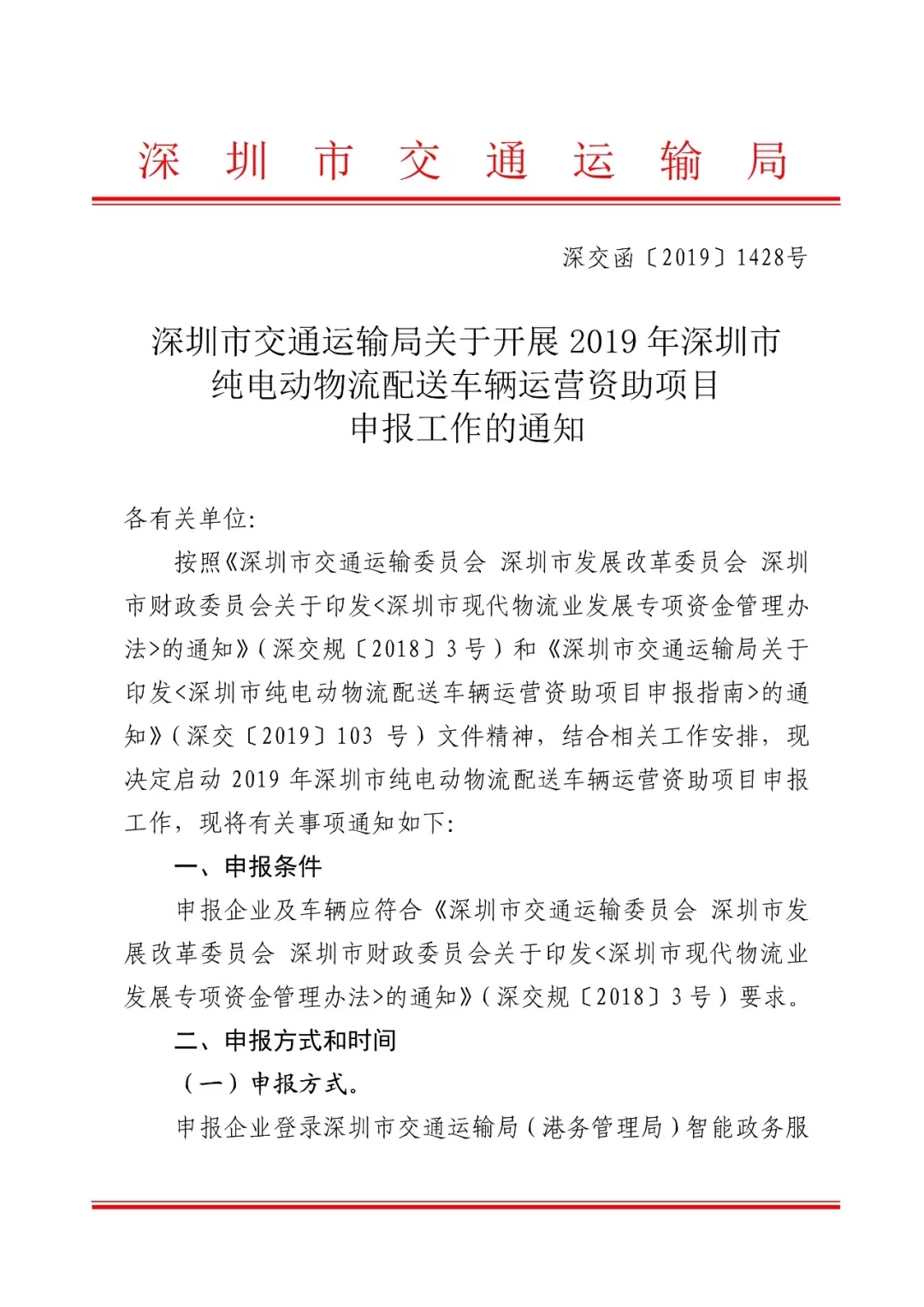 近日,深圳市交通运输委员会、深圳市发展改革委员会、深圳市财政委员会联合发布《深圳市交通运输局关于开展2019 年深圳市纯电动物流配送车辆运营资助项目申报工作的通知》(以下简称”通知“)。《通知》意味着深圳市率先成为全国首个新能源电动物流车辆运营补贴网上申请通道的地方城市!